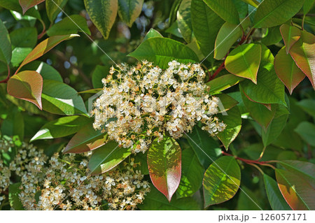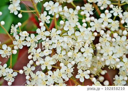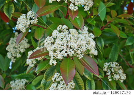 新芽の赤い葉と白い房状の小さな花のカナメモチ