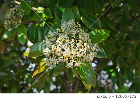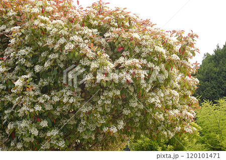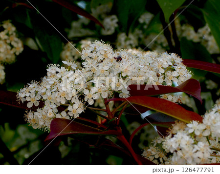 白い花をたくさんつけたカナメガシ(公園の生け垣のベニカナメモチ)