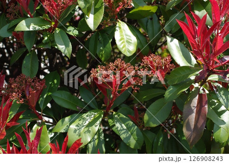 赤と緑の葉が鮮やかなセイヨウカナメモチ(マクロレンズ使用・自然光・接写写真)