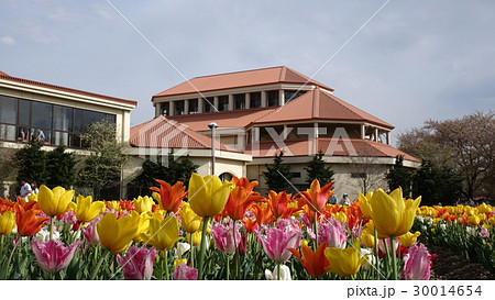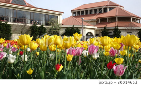深谷グリーンパーク(アクアパラダイスパティオ)チューリップと桜のコラボ 埼玉県深谷市