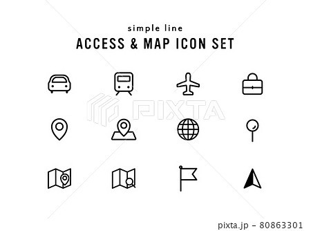 アクセスやマップに関連するアイコンセット イラスト 地図 位置情報 ナビ 交通機関 目的地 ピン