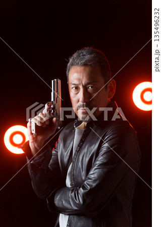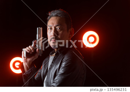 拳銃を持った映画俳優の中高年男性