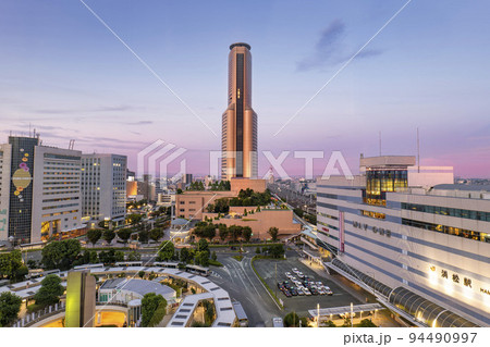静岡県浜松市のJR浜松駅北口の夕方から日没にかけてのの市街地風景