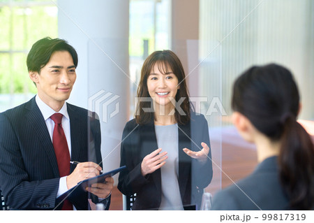 アクリルパーティション越しに話すビジネスマン 感染対策 ソーシャルディスタンス