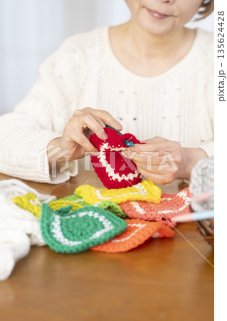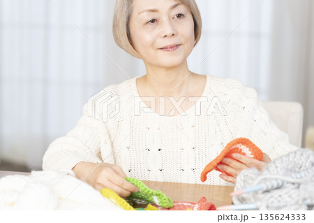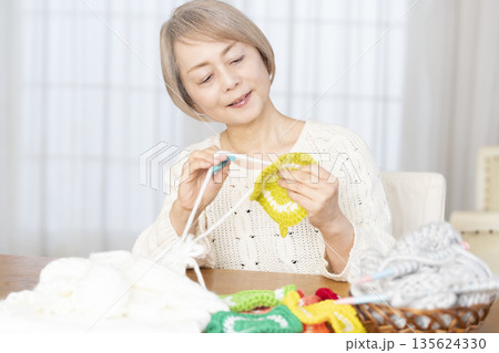 リビングで毛糸のアクリルたわしを編むシニア女性