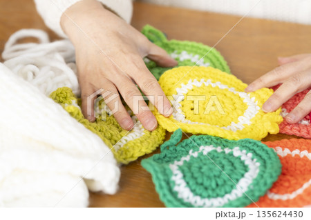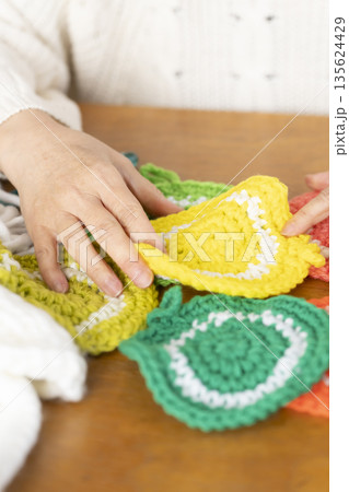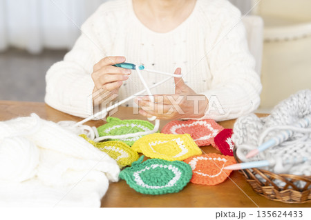 リビングで毛糸のアクリルたわしを編むシニア女性の手元アウトフォーカス