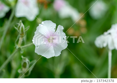 雨上がりの雫が輝く白とピンクのムギセンノウ