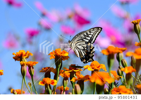 《秦野市・水無川》マリーゴールドの花蜜を吸うアゲハ蝶