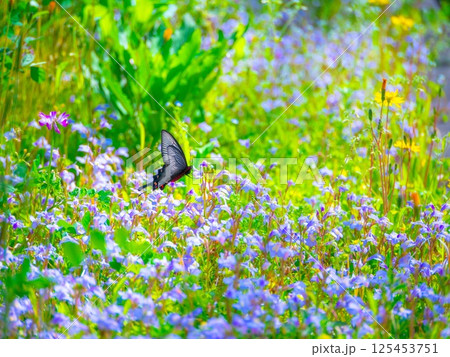 ジャコウアゲハと群生したムラサキサギゴケの花
