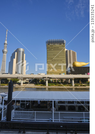 浅草 隅田川 吾妻橋、東京スカイツリー、アサヒビールタワーの風景