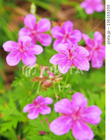 高山の花・咲き乱れるアサマフウロの愛らしい花々・縦位置
