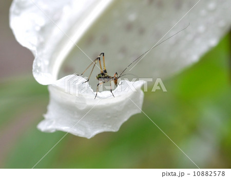 ヤマユリの花びらとアシグロツユムシの幼虫
