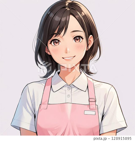 ピンクのエプロン姿で微笑む保育士の女性(白背景)