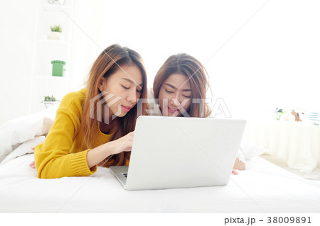 Young cute asia lesbian couple using laptop