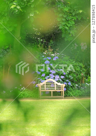 横浜イングリッシュガーデンのあじさいフェア、白いベンチ(6月)神奈川県横浜市西区