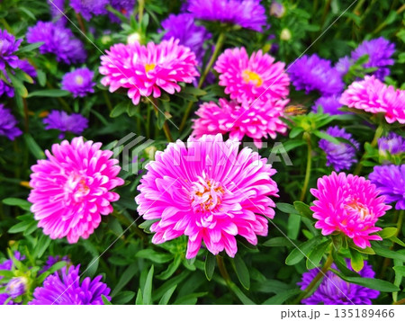 Vibrant purple and pink aster flowers in garden bed. Close-up of blooming asters in various shades of purple and pink among green foliage