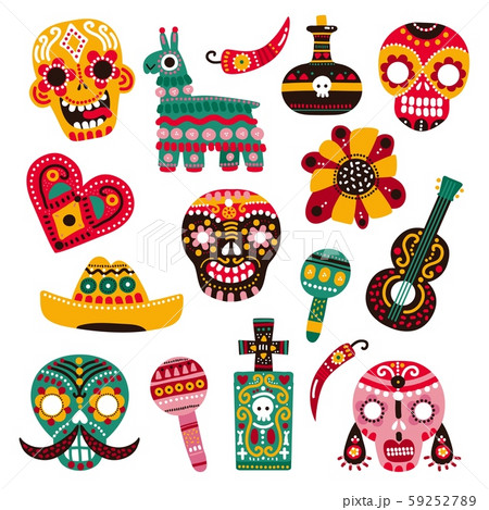 Day of dead. Decorative skulls, guitar and sombrero, llama and hot pepper, heart and grave. Mexican