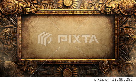 アステカ文明風の黄金の装飾フレーム。歴史的な雰囲気を持つ背景デザイン
