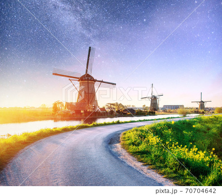 Colorful spring night with traditional Dutch windmills canal in Rotterdam. Wooden pier near the lake shore. Holland. Netherlands. Fantastic starry sky and the milky way