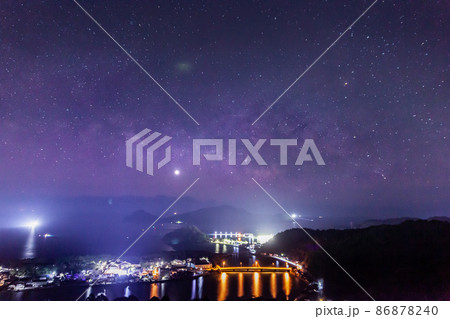 宮崎県日南市南郷城から望むJR細田川鉄橋日南海岸国道220線や遠洋漁船が停泊する目井津港現る天の川