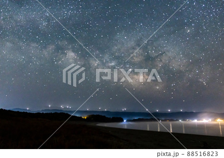 宮崎県串間市一里崎浜からの風力発電所上に広がる星空に横に流れる天の川