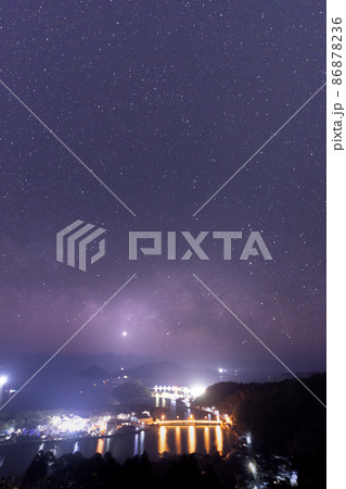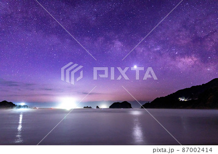 宮崎県日南市南郷町男女島がある夫婦浦海岸の上に広がる星空に横に流れる天の川と海を照らす金星