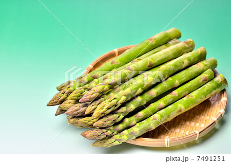 ザルにのせたグリーンアスパラガス 春野菜 水彩イラスト 素材 白背景 コピースペースあり