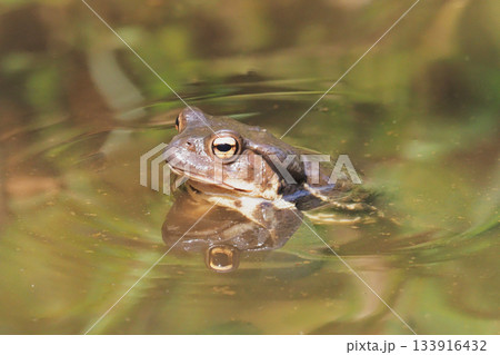 池の畔、濁った水面からオンブするヒキガエルの夫婦が顔だけ出す早春ののどかな里山風景。