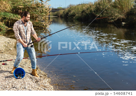Adult man standing near river and pulling fish expressing emotions of dedication