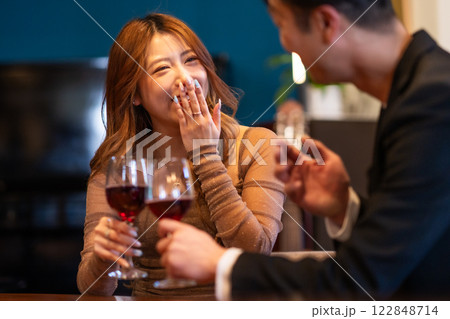 おしゃれなレストランでワイングラスを傾ける男女 顔無し