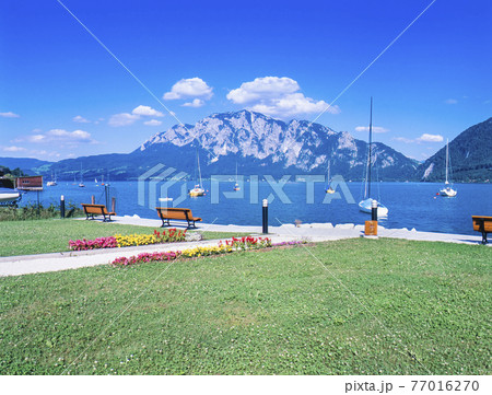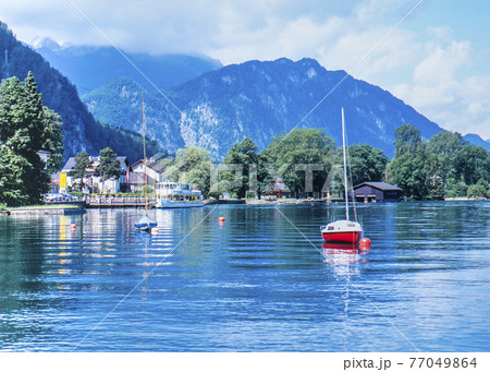 オーストリア ヴァイゼンバッハ アッター湖の民家とヨットに山