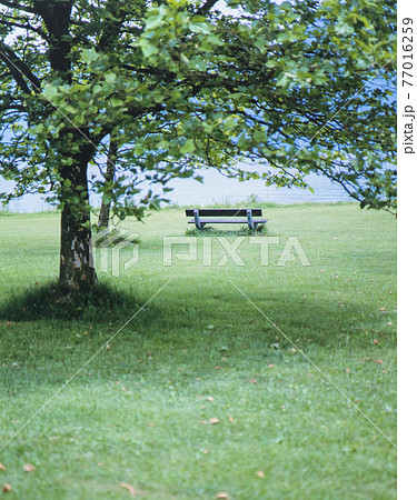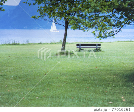 オーストリア アッター湖畔 芝生とベンチ
