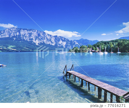 オーストリア アッターゼ 新緑のアッター湖畔に桟橋と山々
