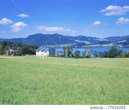 オーストリア アッターゼ 新緑の芝生にアッター湖と白い家