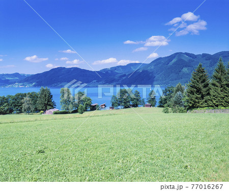 オーストリア アッターゼ 新緑の芝生にアッター湖と山々