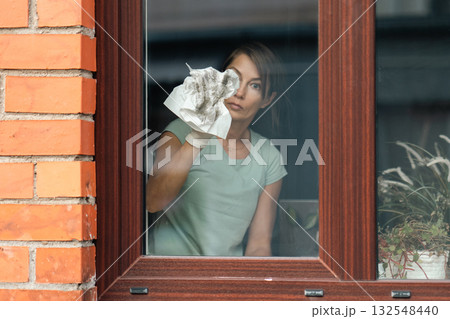 Lady wiping window with concentrated expression, Caucasian woman in casual attire carefully cleaning window in cozy home
