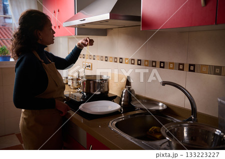 Woman Cooking Pasta In Modern Kitchen With Pot On Stove And Strainer In Sink