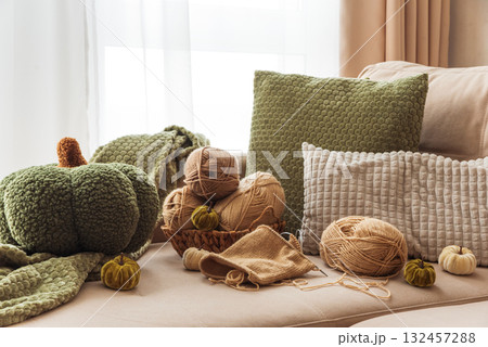 Knitting Basket with Yarn and Velvet Pumpkins in Cozy Autumn Sofa
