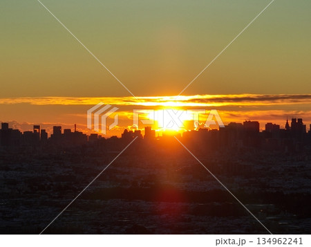 【都内・武蔵野上空から空撮】 都心に昇る朝日