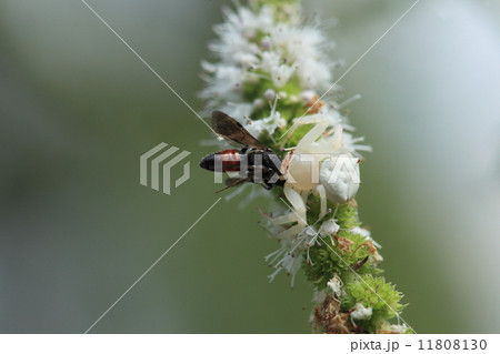 生き物 蜘蛛 アズチグモ、自分より大きなミズホヤドリコハナバチを捕えた
