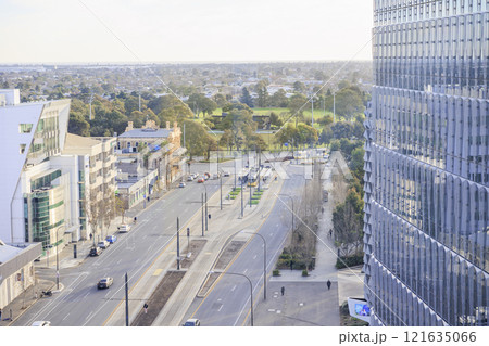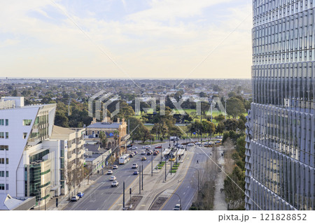 高層ビルから見下ろすアデレードの交通とパーク