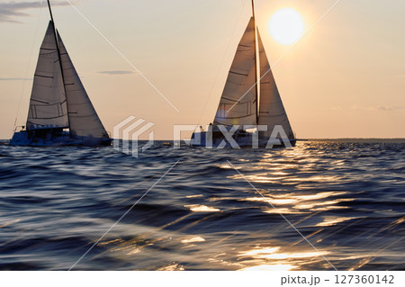 Sailing regatta in the Gulf of Finland at sunset, two sailing yachts competing in a race, splashing water from under the boats, teamwork, board the boat