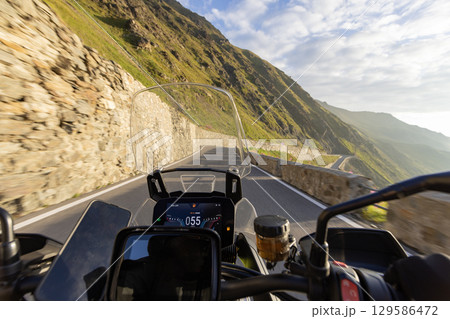 Motorcycle rider riding in Italian Alps during sunrise , handlebar view , dramatic sky . Travel and freedom, outdoor activities