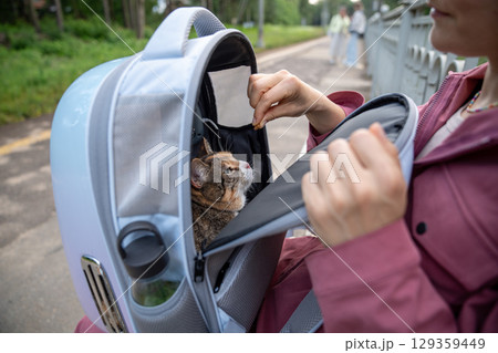 Disgruntled frustrated cat get special snacks in portable carrier outdoors. Behaviour adjustment