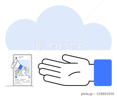 Mobile displaying megaphone alert, outstretched hand, and cloud backdrop. Ideal for digital marketing, cloud storage, online advertising, mobile notifications, campaign management, communication