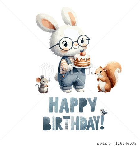 Watercolor birthday card with Cute white Rabbit and friends mouse and squirrel.