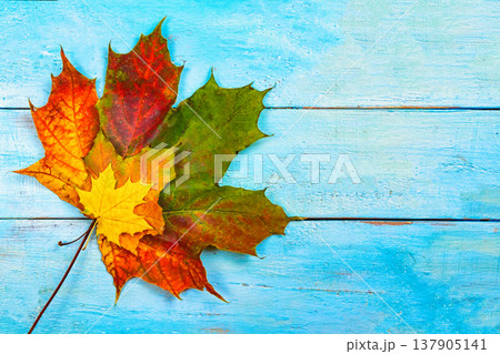 Autumn background of yellow and colored leaves, on a blue wooden background
