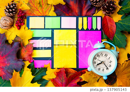 Autumn background of yellow and colored leaves, cones and nuts. place for text.