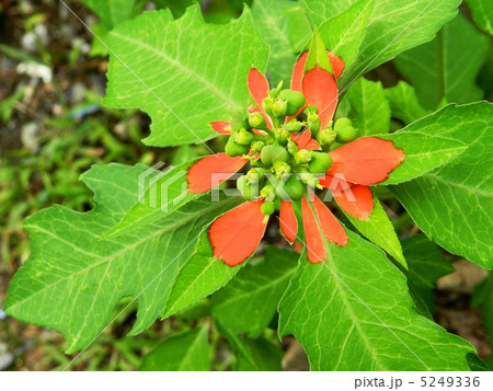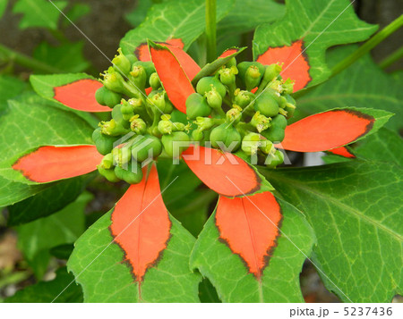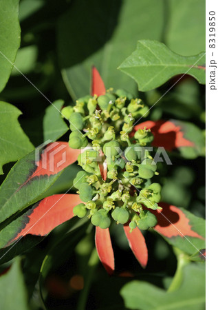 自然 植物 ショウジョウソウ、赤い部分は苞や葉で真ん中に雄花と雌花が固まっって咲きます