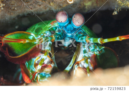 岩の隙間から顔を覗かせる、緑と赤が鮮やかなモンハナシャコ|水中写真